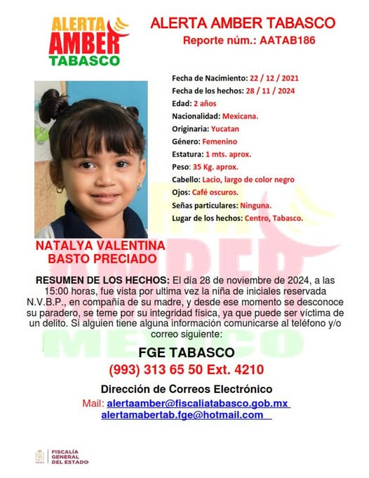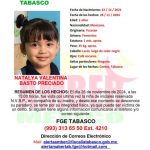 se pide su amable colaboración para difusión de cédula emitida a favor de la niña Nataly Valentina Bastón Preciado, quien desapareció en el municipio de Centro.