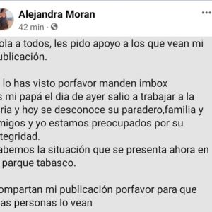 La joven Alejandra Moran publicó en sus redes la desaparición de su papá, quién ayer salió a trabajar a la Feria ubicada en el parque Tabasco y hasta el día de hoy no saben nada de el por lo que pide ayuda para su localización.