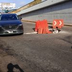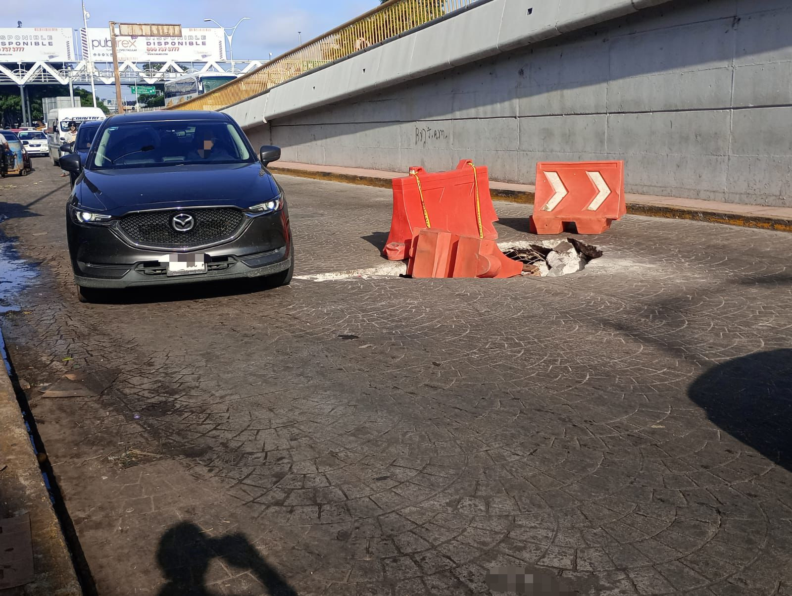 Un socavón en la avenida Adolfo Ruiz Cortines, cerca del Tianguis Jesús Taracena en #Villahermosa, está causando tráfico vehicular. La reparación del socavón todavía no ha iniciado, para evitar accidentes se colocaron bloques color naranja como señalización.