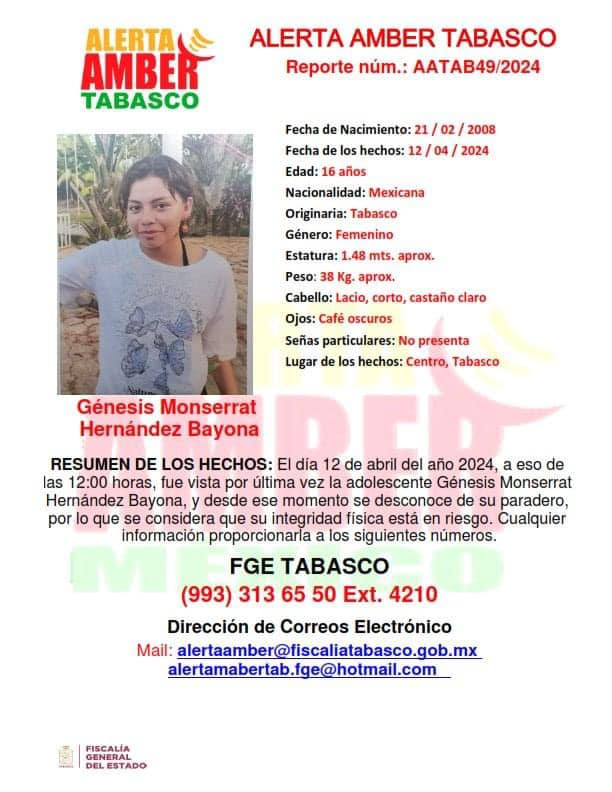 Alerta Amber Tabasco, solicita su amable colaboración para difusión de cédula emitida a favor de la adolescente Génesis Monserrat Hernández Bayona, quien desapareció en el Municipio de Centro, Tabasco.
