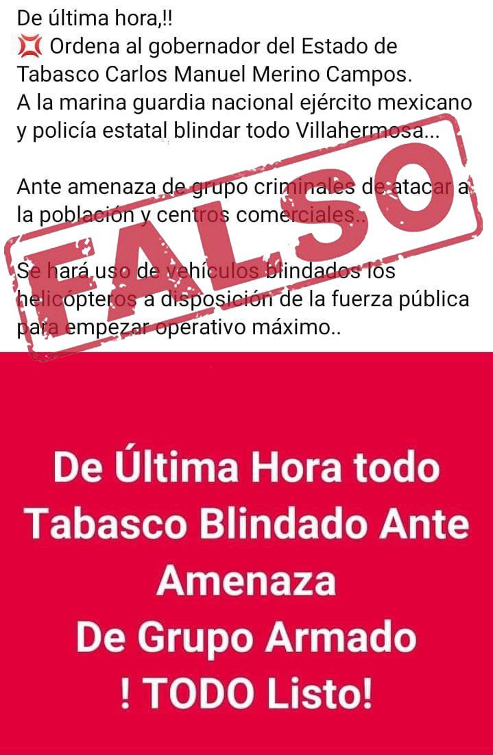 Exhorta Gobierno de Tabasco a no compartir mensaje que circula en en redes, que solo “buscan generar confusión, miedo y zozobra en la población tabasqueña”