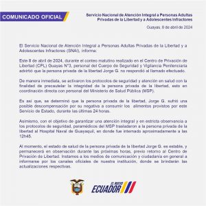 • El exvicepresidente de #Ecuador, #JorgeGlas sufrió una posible descompensación por su negativa a consumir alimentos en prisión; su estado de salud es estable y estará en observación durante las próximas horas.