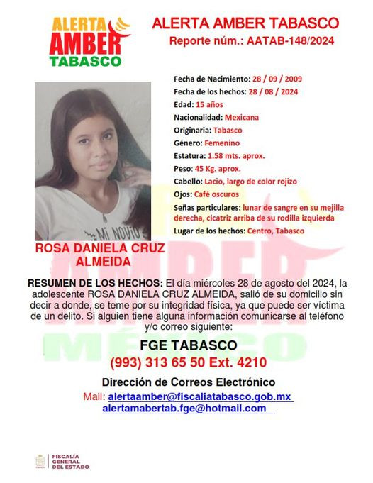 #Tabasco | Alerta Amber, solicita su amable colaboración para difusión de cédula emitida a favor de la adolescente Rosa Daniela Cruz Almeida, quien desapareció en Centro.