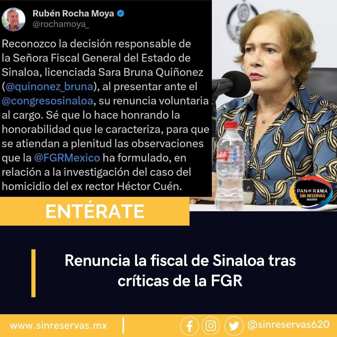 #Entérate | El gobernador Rubén Rocha ha confirmado la renuncia de la fiscal de Sinaloa, motivada por las observaciones realizadas por la Fiscalía General de la República (FGR) en relación con el caso Cuén.