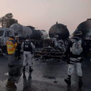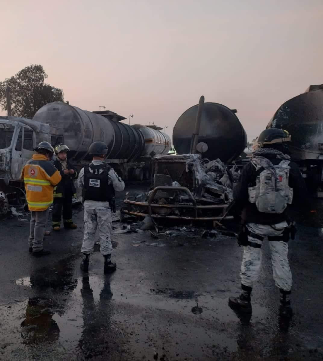 • en apoyo a las acciones de protección civil, brinda seguridad perimetral en las inmediaciones donde se registró la explosión de pipas de gas en los límites de los municipios de Tlahuelilpan y Tula en #Hidalgo.