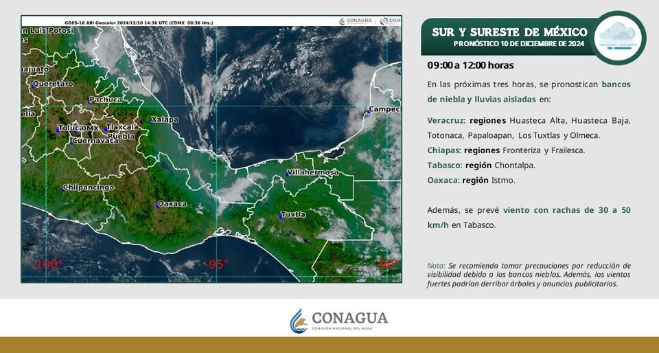 #Clima | Regiones de Veracruz, Chiapas, Tabasco y Oaxaca amanecerán con niebla y lluvias aisladas, mientras que en Tabasco se esperan vientos con rachas de 30 a 50 km/h.