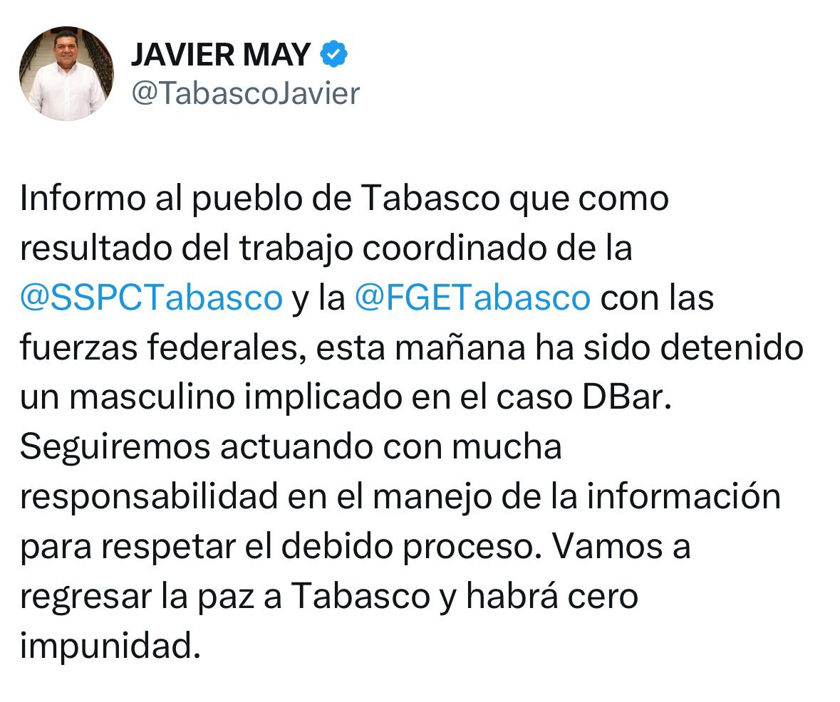 El gobernador de Tabasco, Javier May Rodríguez, anunció en sus redes sociales la captura del primer implicado en el caso “DBAR”, que resultó en al menos seis personas fallecidas y diez lesionadas.