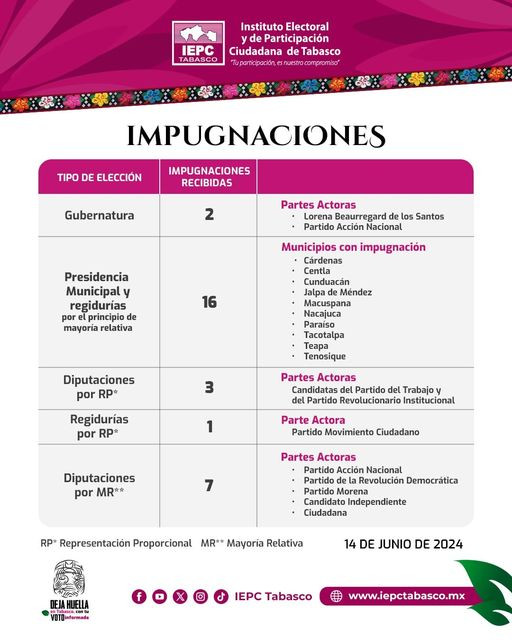 #Entérate El IEPCT da a conocer las impugnaciones que se han registrado del proceso electoral reciente. Las cuales son 29, entre ellas para la gubernatura, las cuales recibió en los 4 días después de las elecciones como lo marca la ley electoral en Tabasco.