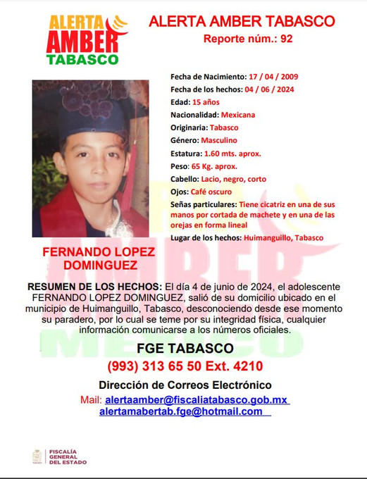 Se busca a Fernando López Domínguez, de 15 años, desaparecido desde el 4 de junio en Huimanguillo, Tabasco. Cualquier información sobre su paradero, comunicarse con las autoridades locales.