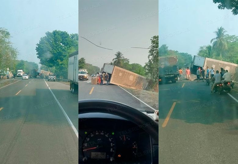 Vuelca camión de carga en el kilómetro 67 de la carretera libre Cárdenas – Coatzacoalcos; la carga está siendo rapiñada.