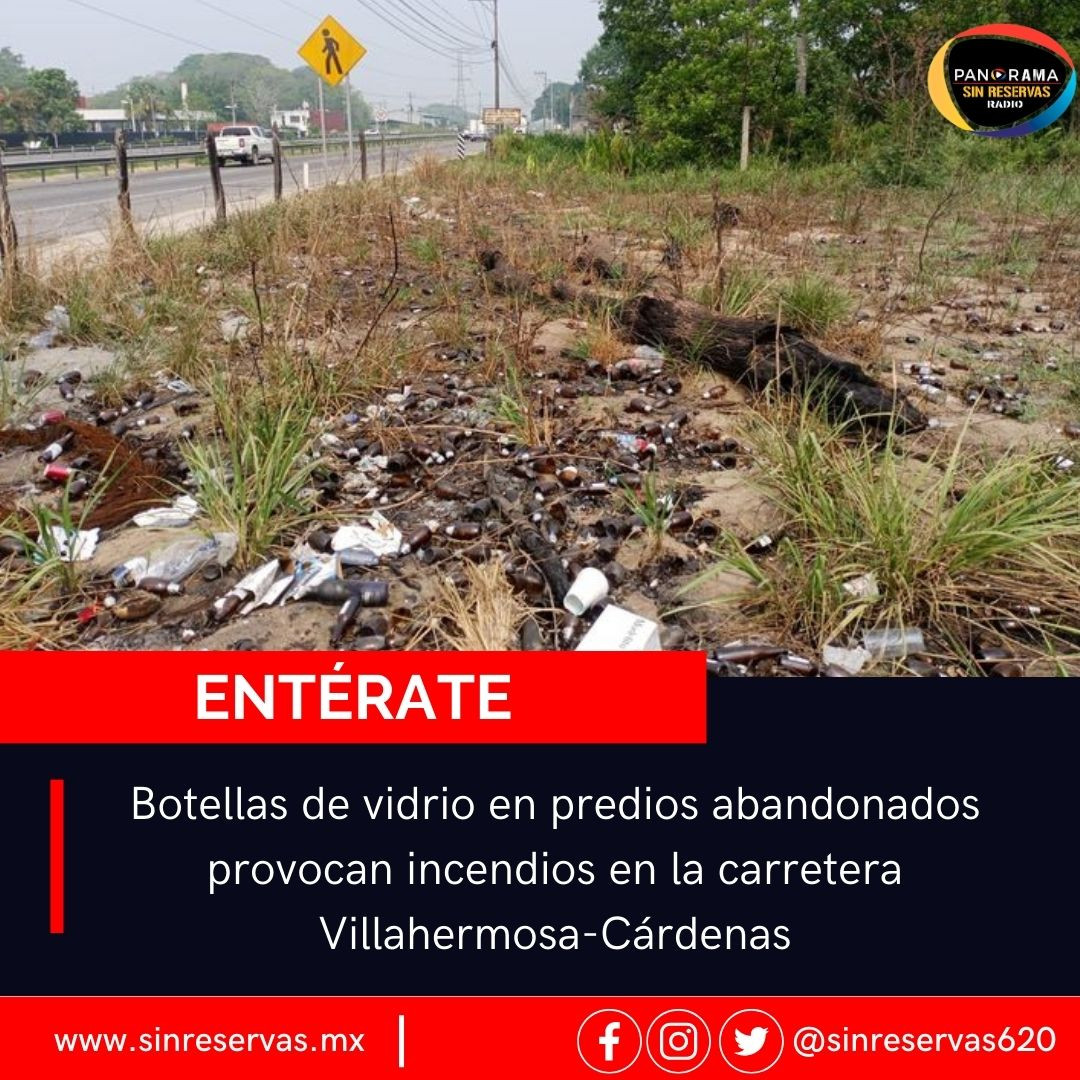 #Entérate | En varios predios abandonados a lo largo de la carretera #Villahermosa – #Cárdenas, se ha observado un tiradero de botellas de vidrio que provoca incendios de pastizales debido al efecto lupa que producen.