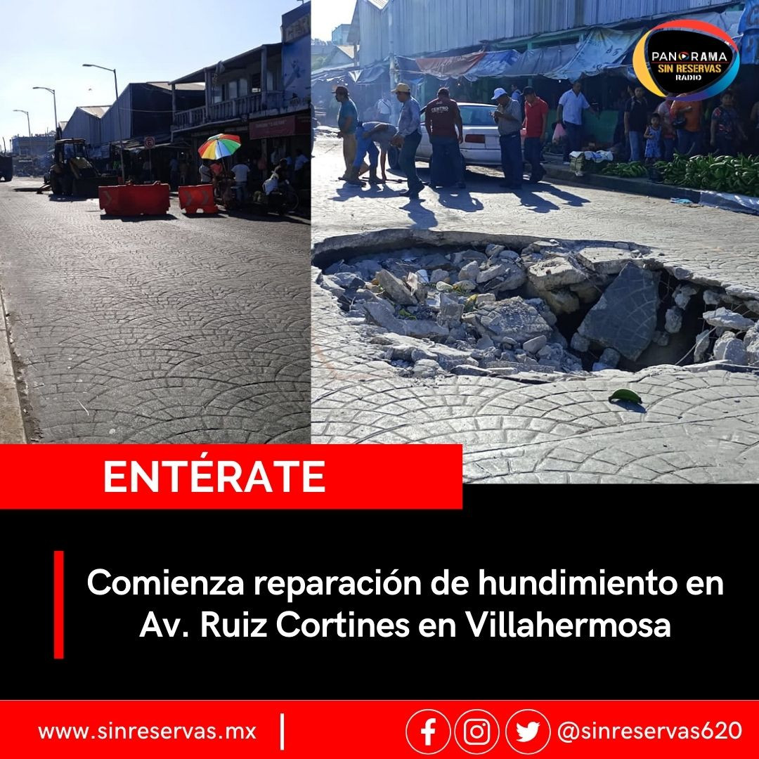 Obras Públicas del Ayuntamiento de Centro trabaja en la reparación de un hundimiento en la Av. Adolfo Ruiz Cortines, en inmediaciones del tianguis Jesús Taracena. Se espera concluir los trabajos este fin de semana para evitar riesgos a peatones y conductores.