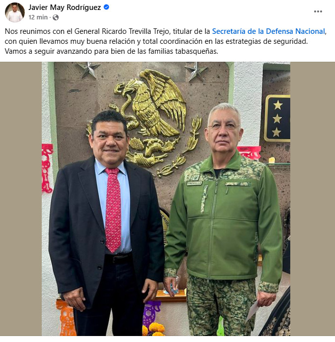 El gobernador de Tabasco, Javier May Rodríguez, sostuvo un encuentro con el titular de la Secretaría de la Defensa Nacional (SEDENA), Ricardo Trevilla Trejo. La reunión abordó temas de seguridad y coordinación interinstitucional para fortalecer la paz y protección en el estado, reforzando así los esfuerzos conjuntos entre el gobierno estata…Leer más