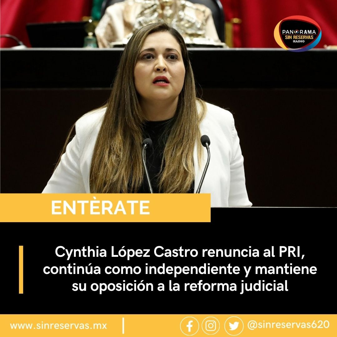 La senadora Cynthia Iliana López Castro anunció su renuncia al PRI y confirmó que seguirá como legisladora independiente. También reiteró su oposición a la reforma del Poder Judicial, subrayando que mantendrá una postura crítica para defender la autonomía judicial en su labor legislativa.
