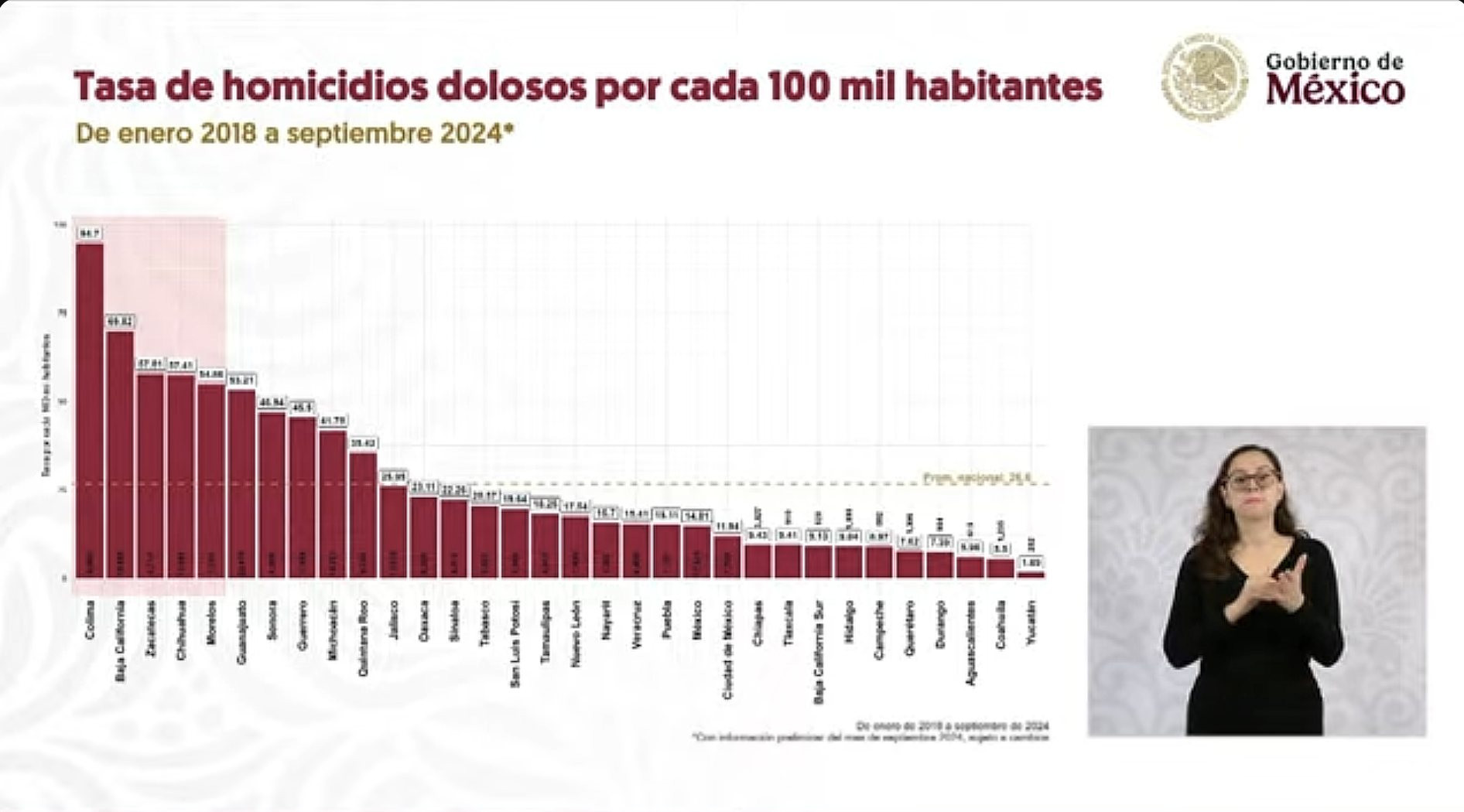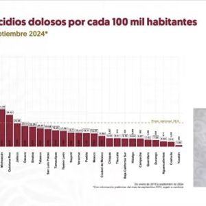 Omar García Harfuch, secretario de Seguridad y Protección Ciudadana, dio a conocer la nueva estrategia nacional de seguridad centrada en cuatro ejes fundamentales. Durante la presentación, mostró una gráfica que refleja la tasa de homicidios dolosos en México, además de un modelo de atención integral enfocado en combatir la violencia desde una per…Leer más