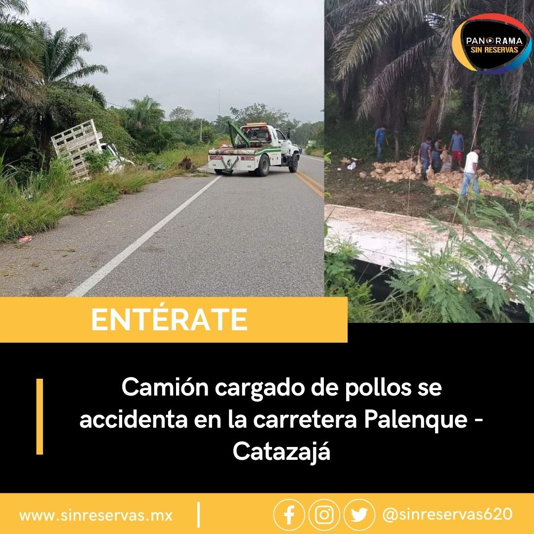 En la madrugada de este jueves, un camión cargado de pollos se salió de la carretera Palenque – Catazajá, cerca de las grúas del Pino. Afortunadamente, el chófer salió ileso, aunque más de la mitad de los pollos que transportaba murieron instantáneamente, mientras que unos pocos lograron sobrevivir. Las pérdidas fueron únicamente materiales.