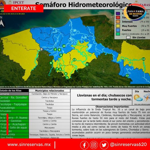 #clima | Protección Civil de Tabasco ha comunicado que la Onda Tropical No. 16, junto con un canal de baja presión, provocará lluvias muy fuertes de hasta 75 mm en la región de La Sierra y en los municipios de Balancán, Cárdenas, Huimanguillo y Macuspana. En el resto del estado, se prevén precipitaciones fuertes de hasta 50 mm.